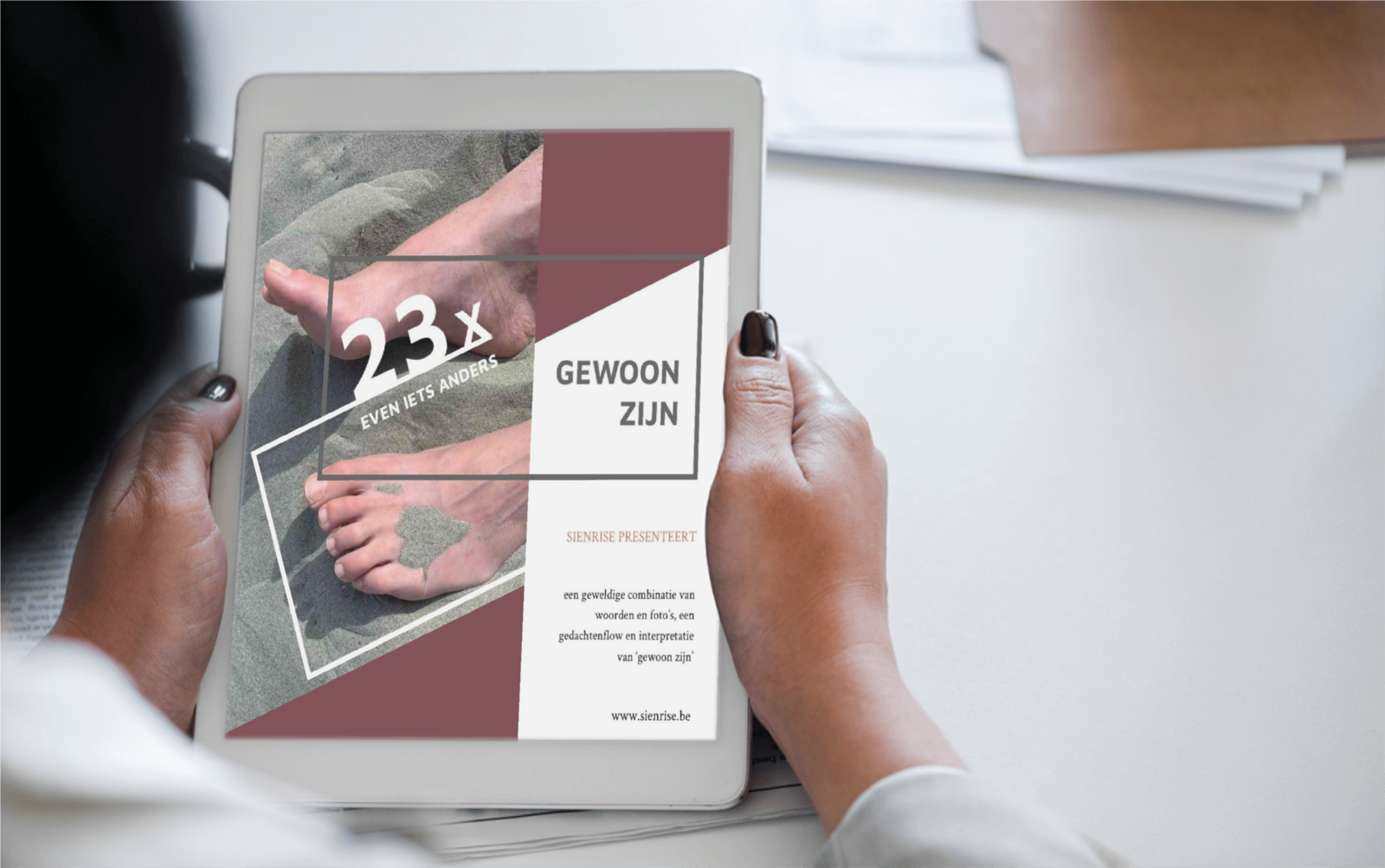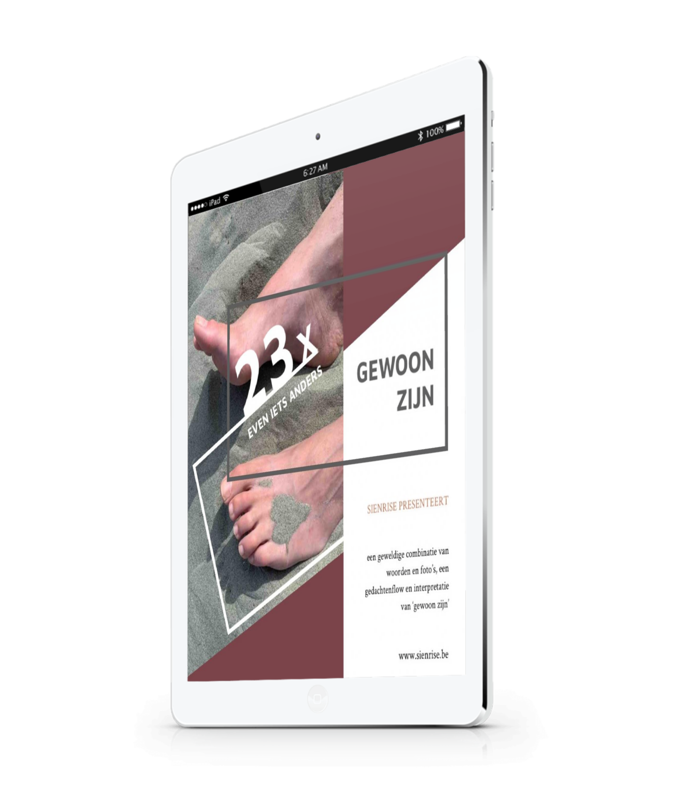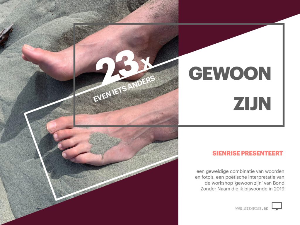 Ebook “23x gewoon zijn”. Even iets anders. De visualisatie van een gedachtenstroom tijdens een workshop van Bond Zonder Naam ‘gewoon zijn’ die ik in 2019 volgde. Wat resulteerde was een mooie tekst. Deze hersenspinsels zijn in dit ebook weergegeven in combinatie met een selectie van ‘voetenfoto’s’ omdat ik die leuk vond passen bij het thema ‘gewoon zijn’.