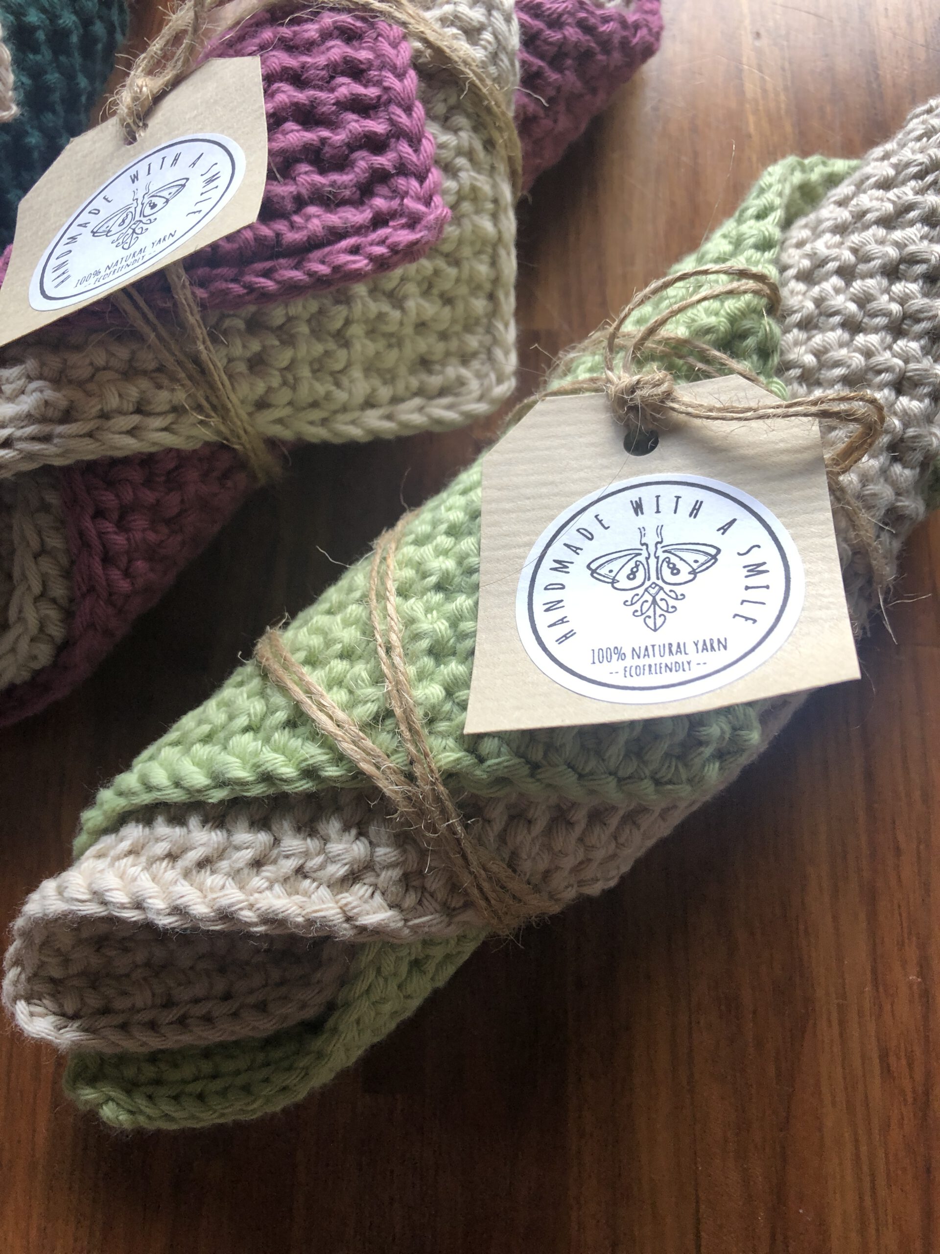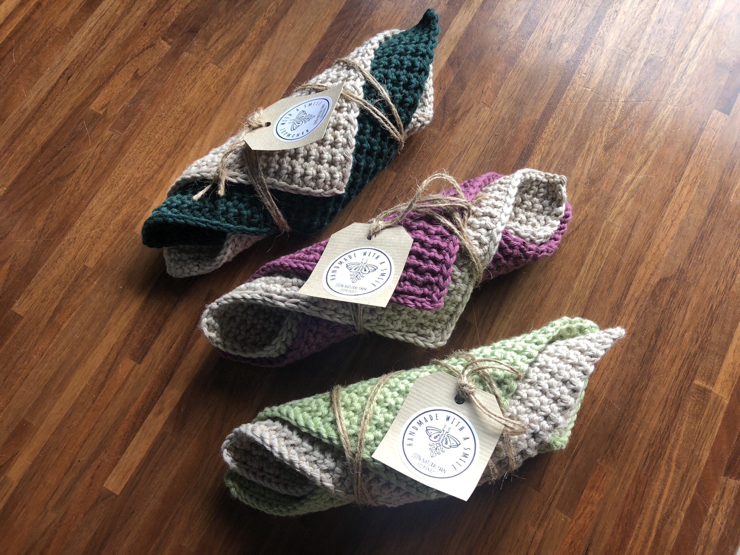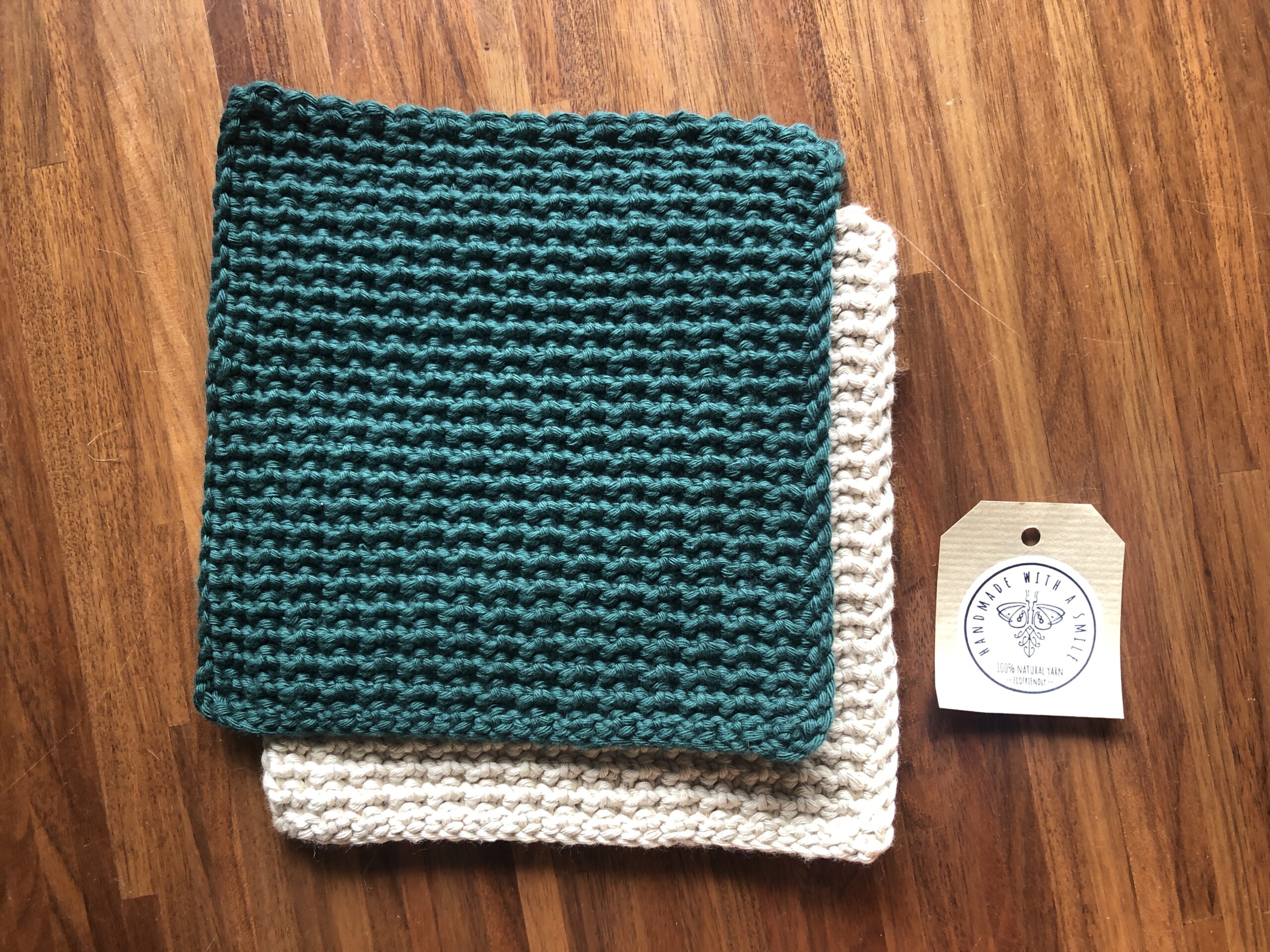 Set of 2 cotton cloths with a firm but soft scrubbing texture for wiping down benches and cleaning the bathroom.  You can use this as pot holders or large coasters as well.  Reusable and thereby ecofriendly. Available in different colours.  Handmade with a smile.