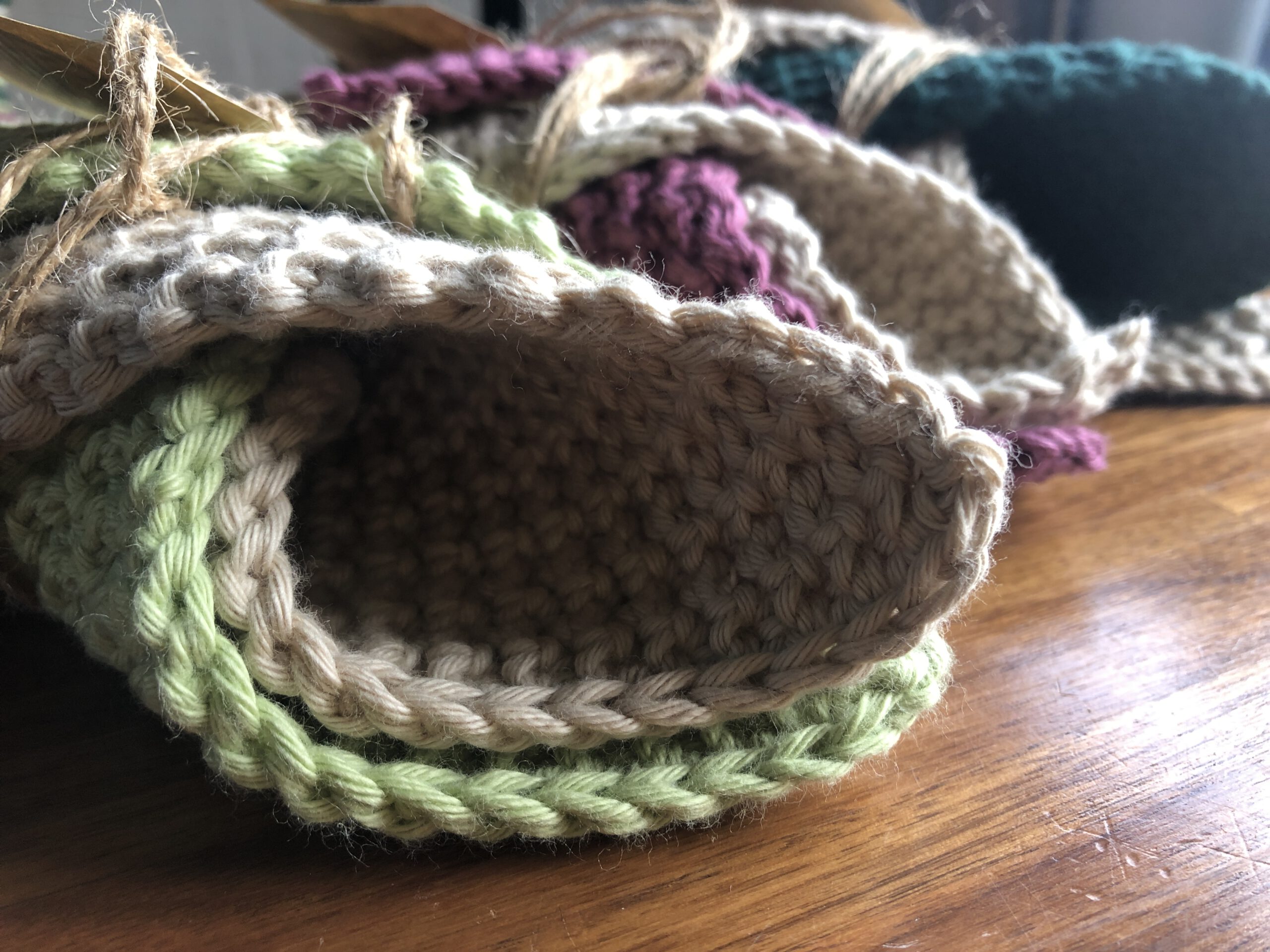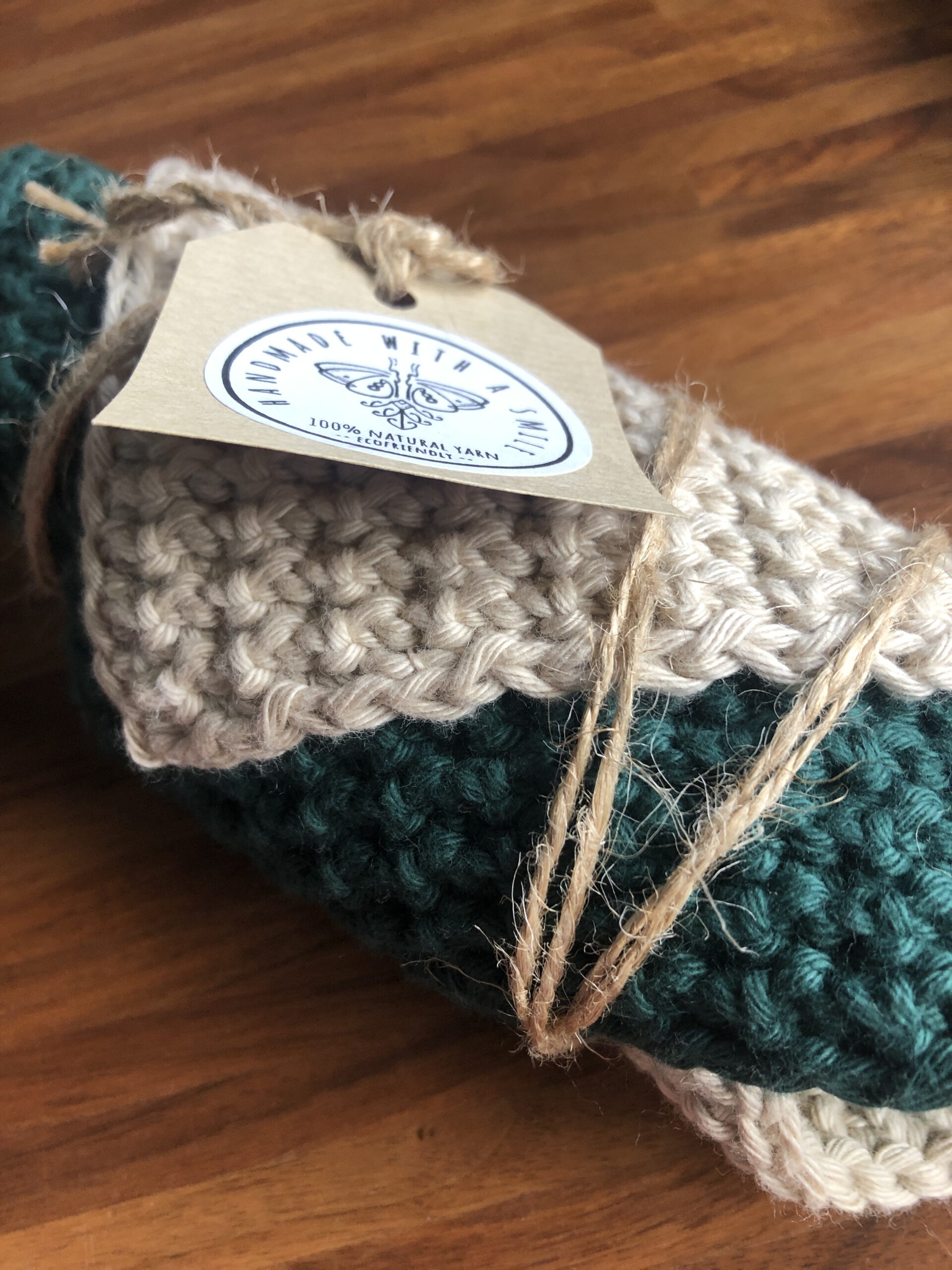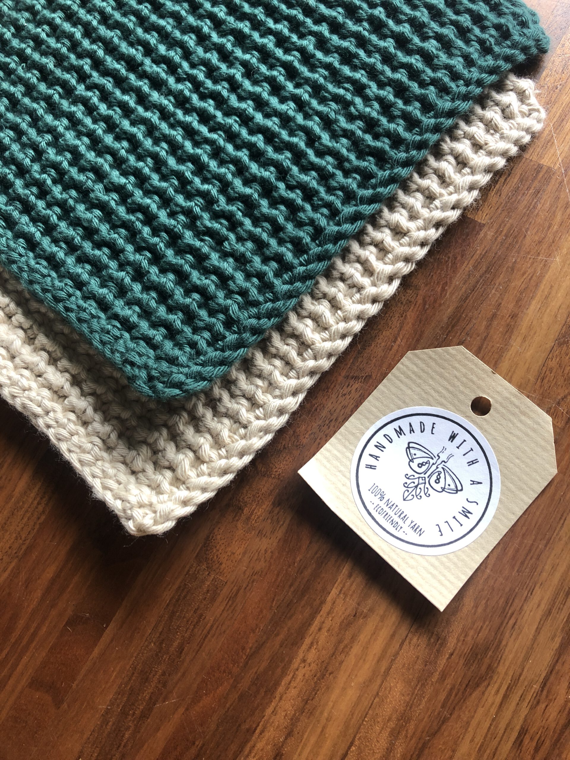 Set of 2 cotton cloths with a firm but soft scrubbing texture for wiping down benches and cleaning the bathroom.  You can use this as pot holders or large coasters as well.  Reusable and thereby ecofriendly. Available in different colours.  Handmade with a smile.
